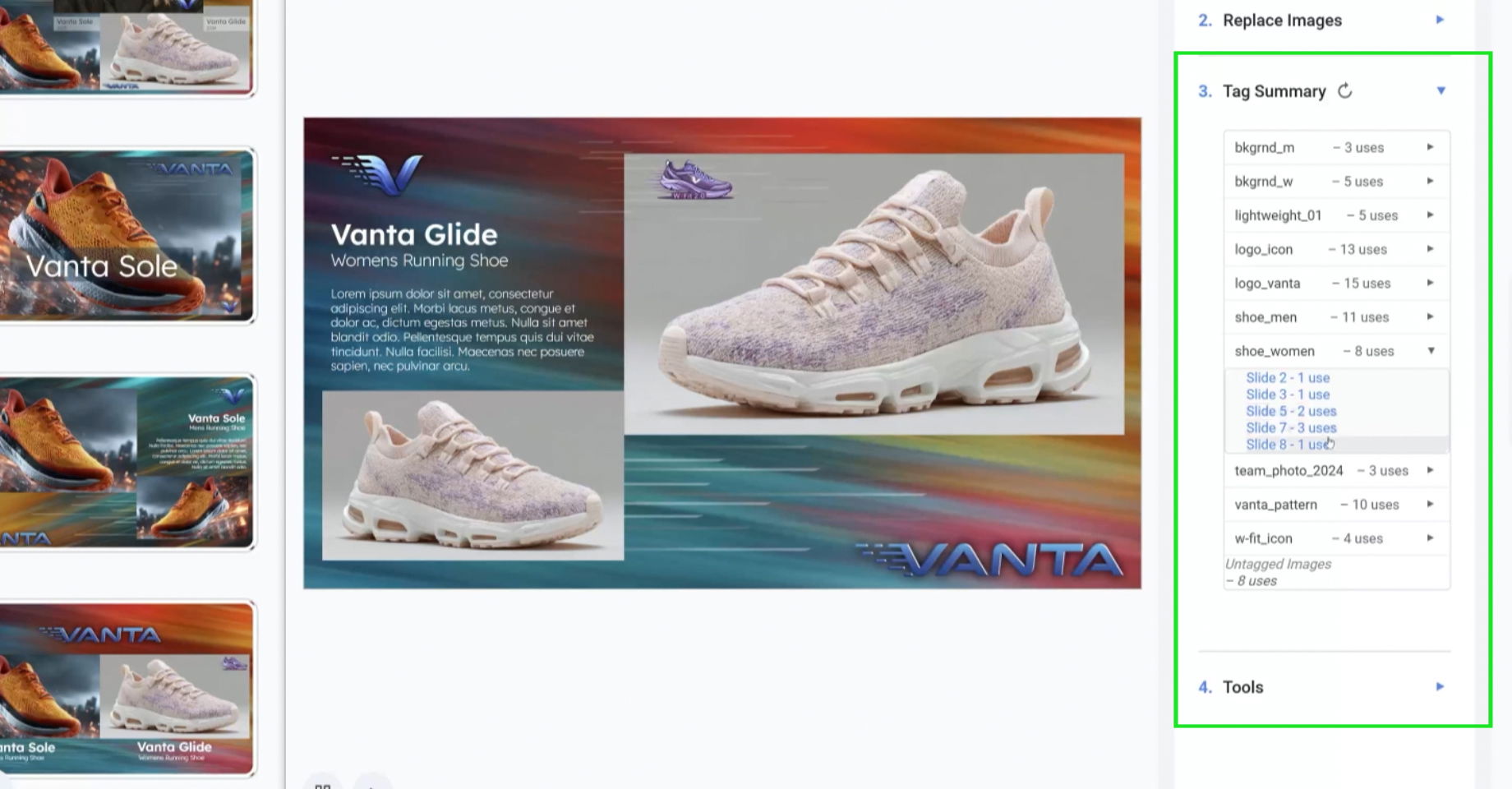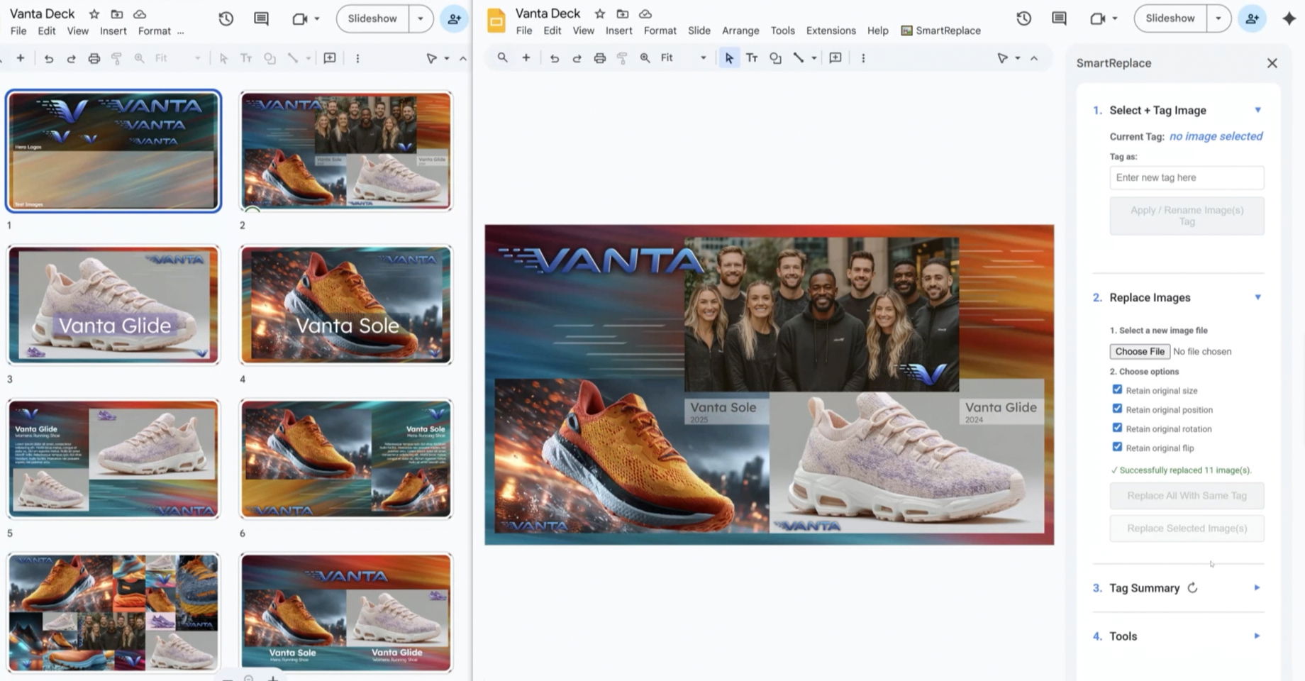 SmartReplace is the simplest way to import and update logos, product shots, charts, maps, and other visuals across your entire presentation. SmartReplace also includes features like multi-image uploads, and easy image navigator.